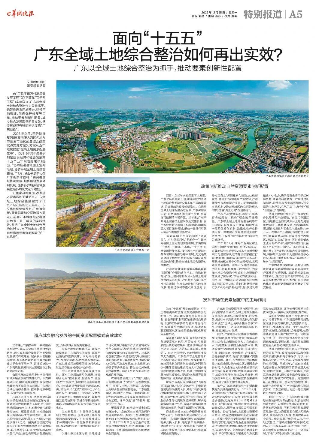 在国家战略叠加、改革进入深水区的关键节点,广东全域土地综合整治做对了什么?站在新的历史起点,广东又将如何继续发力,在制度创新、要素配置和空间治理方面走在前列?羊城晚报记者通过梳理广东三年来的实践经验,共话广东全域土地综合整治的过去、当下与未来,探寻自然资源要素创新配置的“广东路径”。
